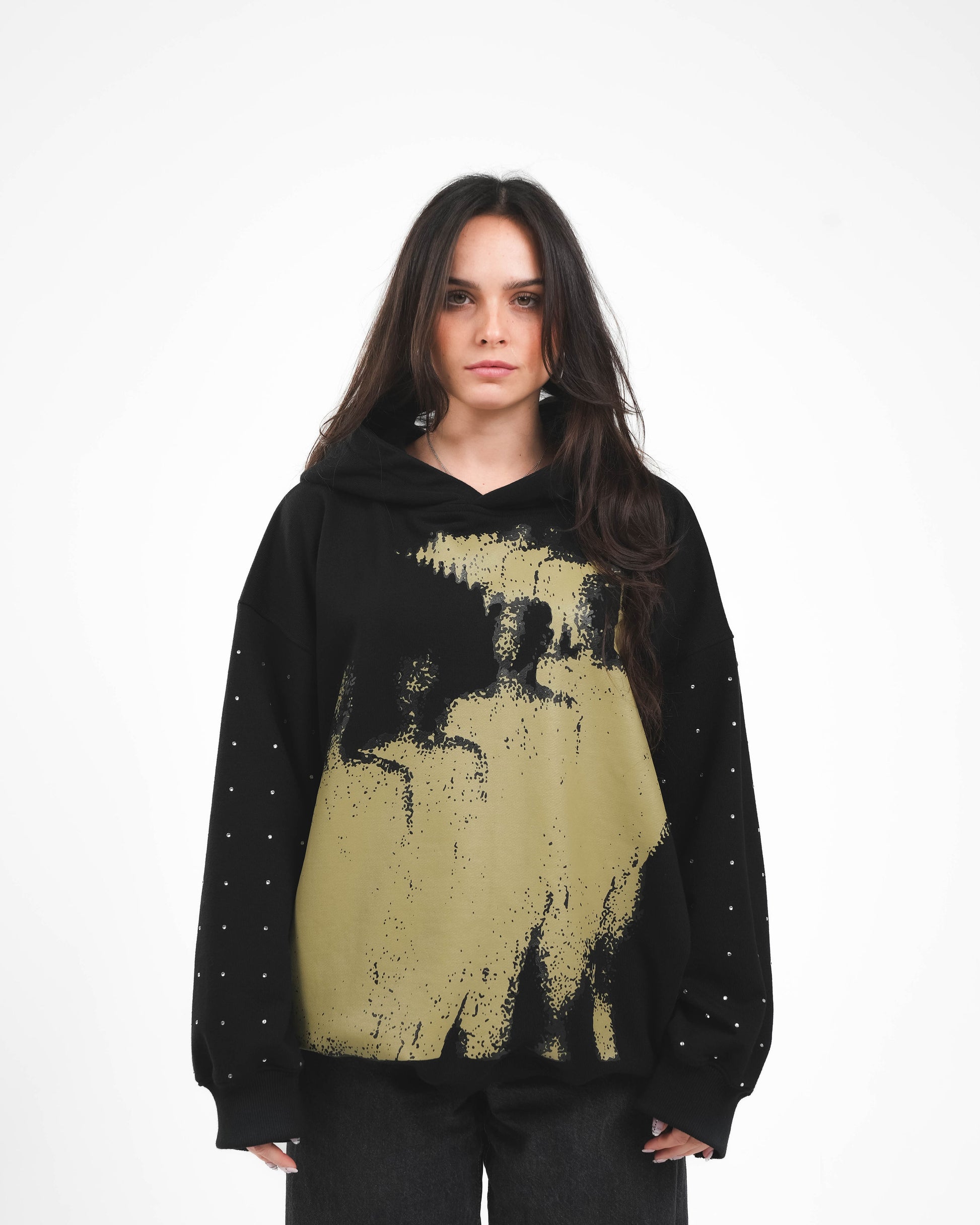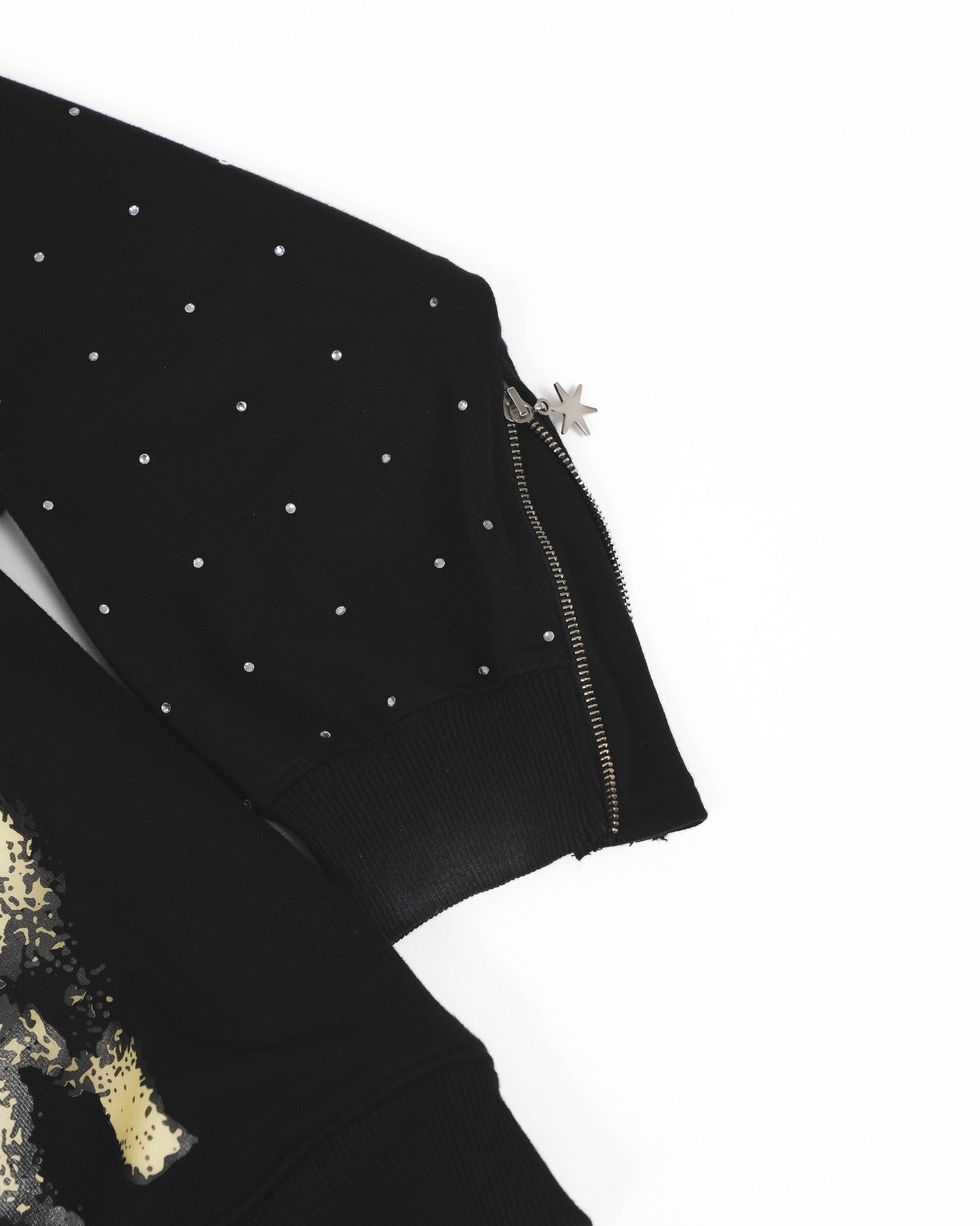 - Rękawy pokryte kryształkami i wykończone customizowanymi zamkami